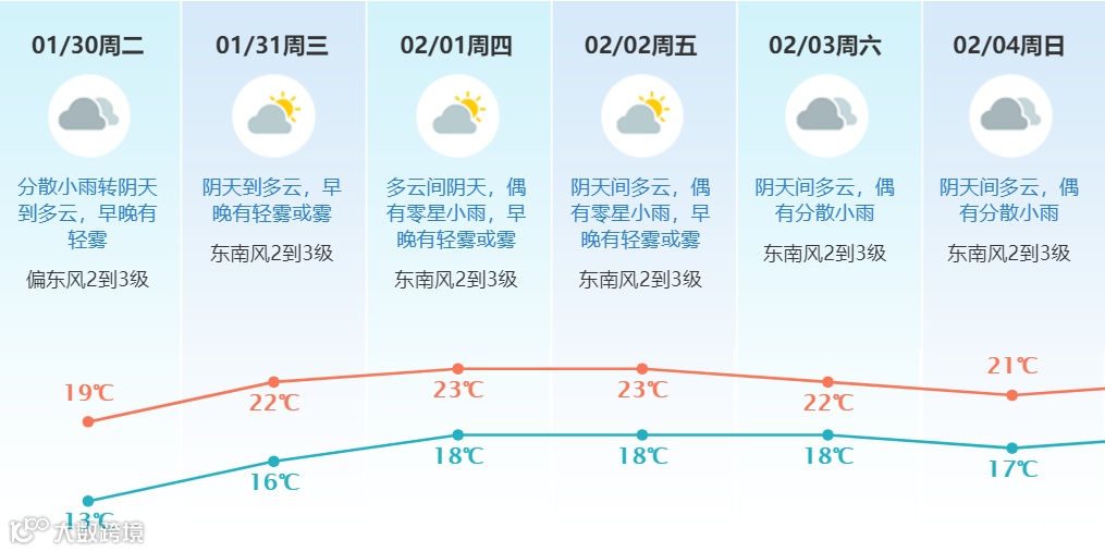 1月30日:小到中雨转阴天到多云,气温:13到19度,偏东风2到3级。