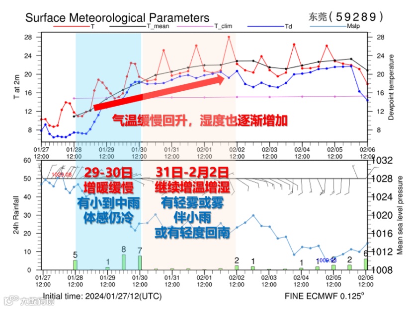 31日-2月2日,东南暖湿气流上岸,继续增温增湿,早晚有轻雾或雾以及小雨,并可能伴有轻度回南现象。