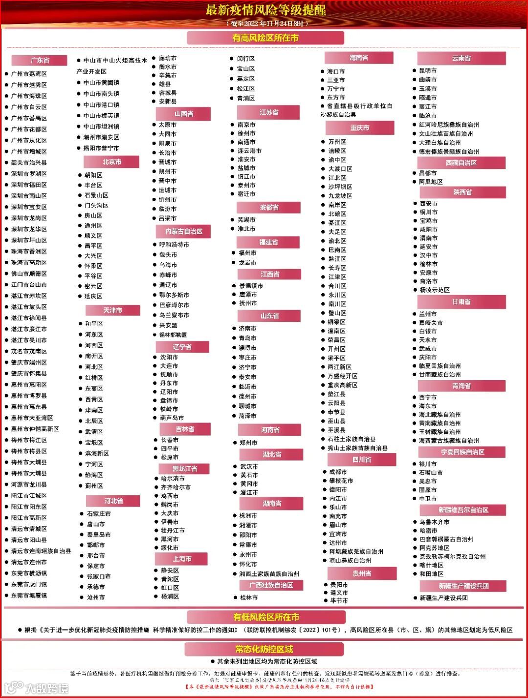 1. 数据来源截至[国家卫生健康委]疫情风险等级查询11月24日8时的更新。