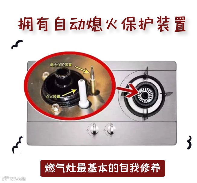 PS:如果燃气灶没有自动熄火保护装置,一旦发生意外熄火,易导致燃气泄漏等危险状况!