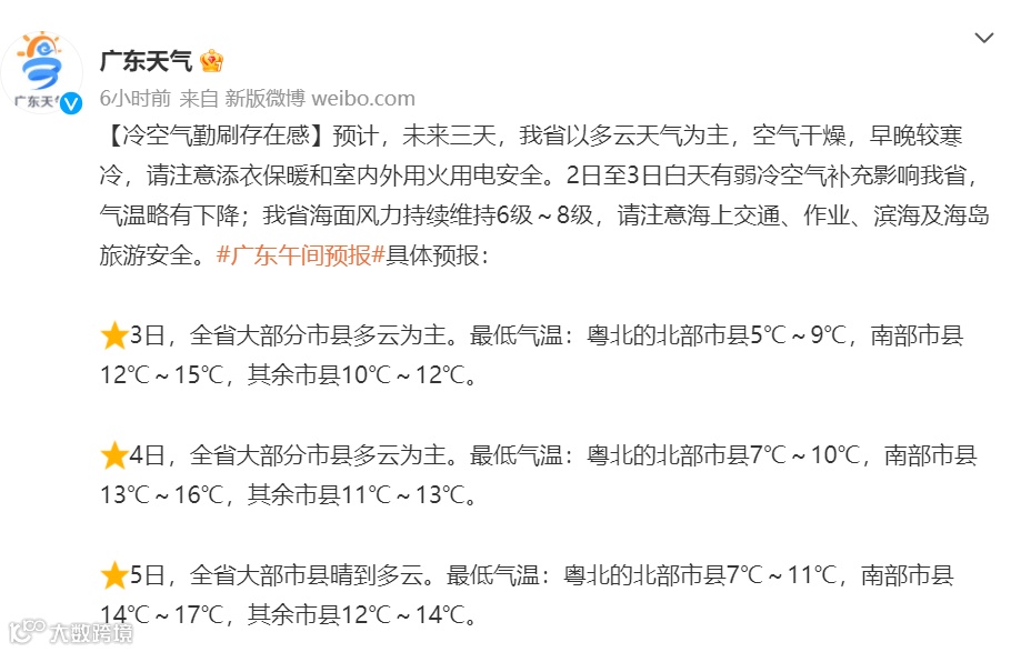 预计5日—6日,一股新冷空气即将补充,强度偏弱。未来几天广东以多云间阴天为主,天气较干燥,气温日较差大,早晚较寒冷,防火防燥防寒别松懈。