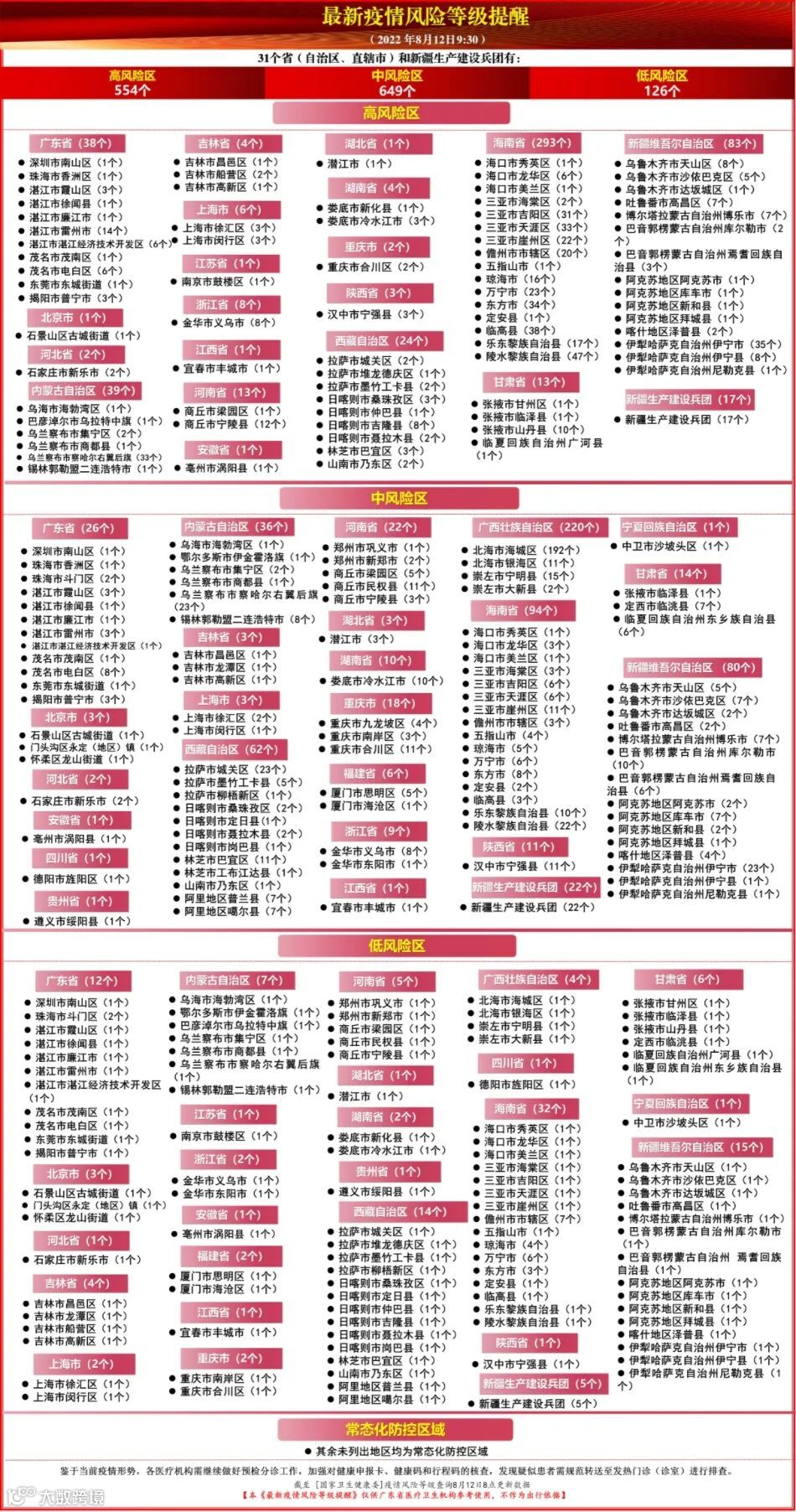 1. 本表来源“广东省卫生健康委官网”发布,数据来源截至[国家卫生健康委]疫情风险等级查询8月12日8点的更新。