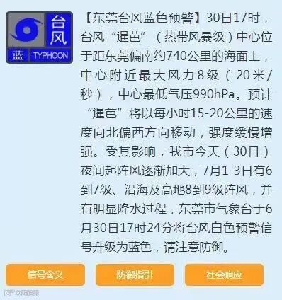东莞市已发布台风蓝色预警信号,根据《东莞市防汛防旱防风防冻应急预案》,经会商研判,市三防指挥部决定启动防风Ⅳ级应急响应。