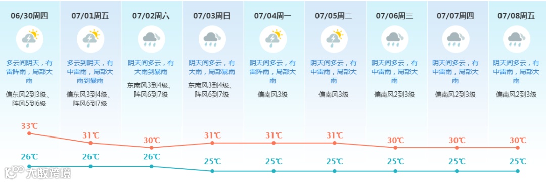 预计我市7月1-3日受台风“暹芭”环流影响,有大雨到暴雨降水过程,并伴有雷暴和6到7级、沿海及高地8到9级阵风,高温天气有所缓解;