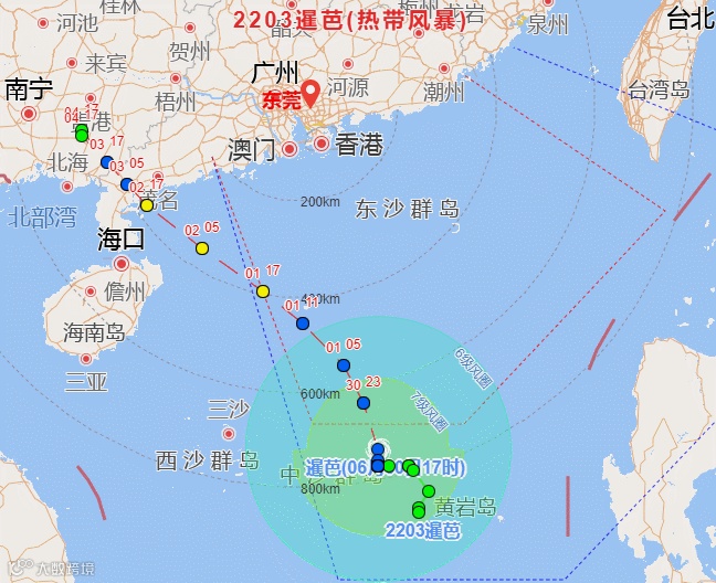 今年第3号台风“暹芭”已于6月30日夜间加强为强热带风暴级,7月1日8时其中心位于距离东莞市偏南方约524公里的南海海面上,中心附近最大风力10级(25米/秒)。