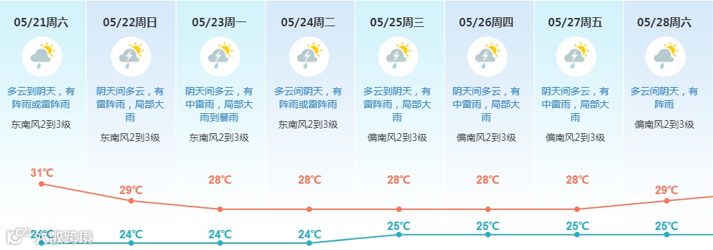 25-27日:受西南季风影响,天气不稳定,仍持续多雷雨天气;