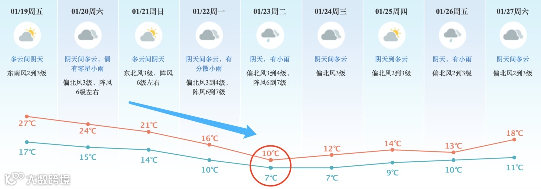 20-23日受强冷空气影响,气温连日持续下降,天气转寒冷,23日最低气温将跌至个位数,最低气温为23-24日早晨的7-8℃。
