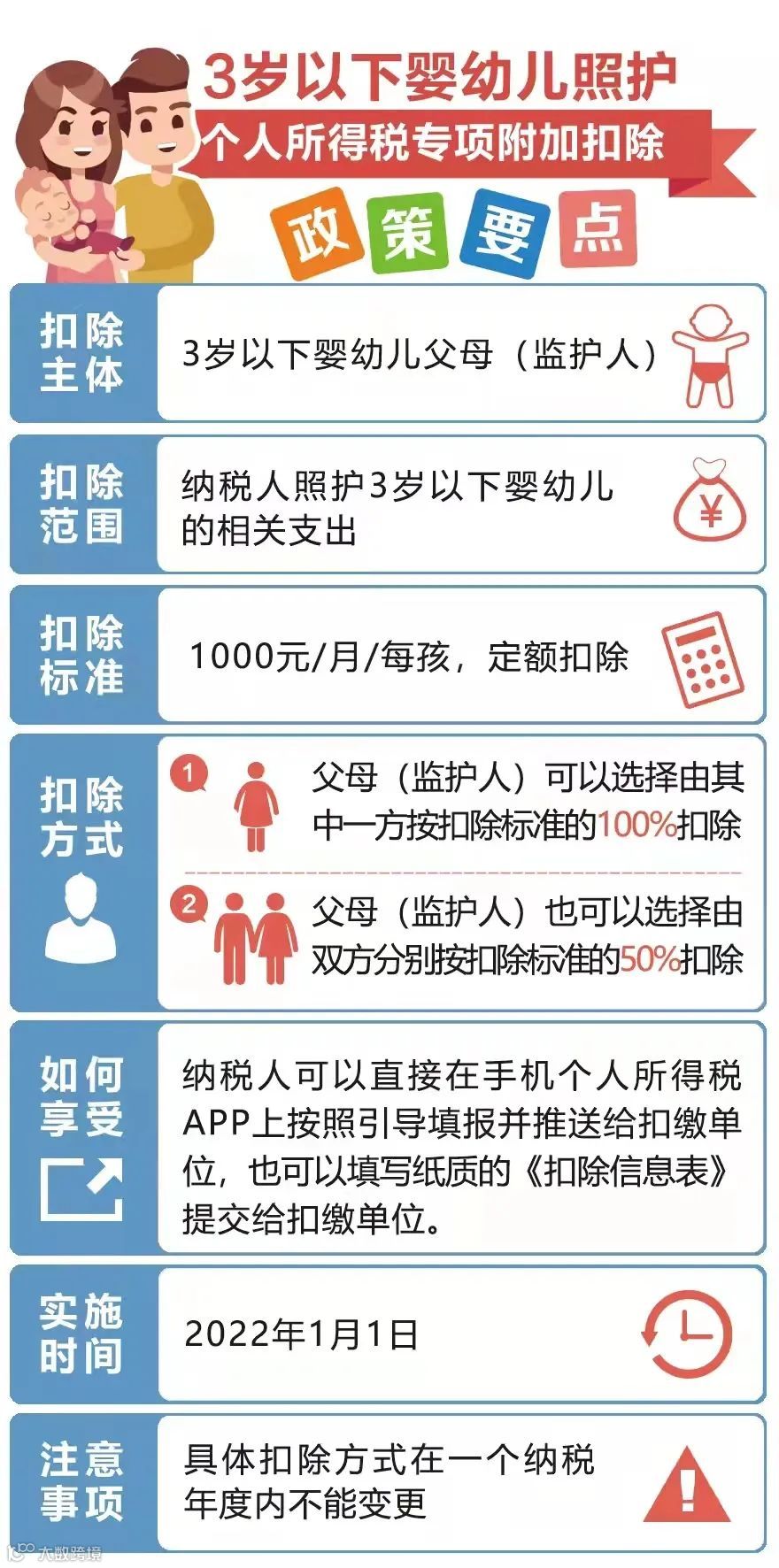 例如,纳税人的子女在2021年10月出生,自2022年1月1日起纳税人即符合专项附加扣除享受条件。纳税人4月份将婴幼儿信息提供给任职受雇单位,单位在发放4月份工资时即可为纳税人申报1至4月份累计4000元的专项附加扣除。