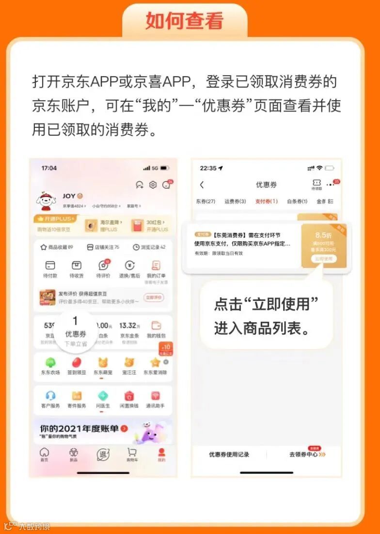 查看:用户可通过京东APP或京喜APP、登陆已领取消费券的京东账户,在“我的”—“优惠券”页面点击“立即使用”进入商品列表。