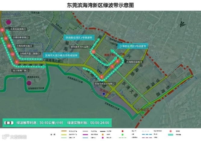绿波推荐时速为50-60公里/小时,如果从沙角半岛进入交椅湾以55km时速行驶,大家就可以体验到从第一处红绿灯转绿开始连续4个红绿灯路口,一路都是绿灯。