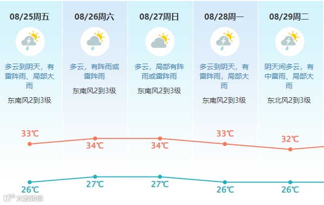 26-27日以多云天气为主,午后有阵雨或雷阵雨;