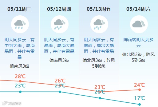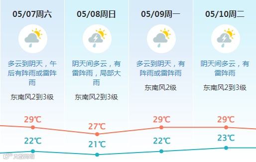 5月7-10日,天气转不稳定,有阵雨或雷阵雨,间中雨势较大;
