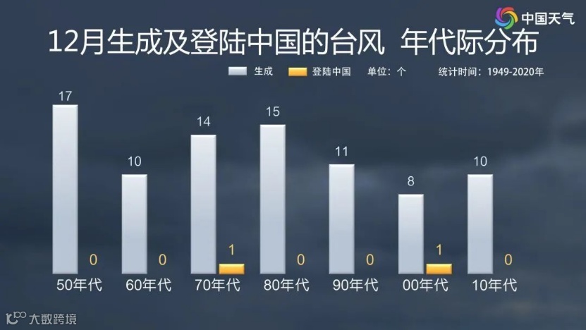 过去72年中,南海和西北太平洋12月份都有台风生成,不过普遍位置偏南,且大多会在海上消亡或西行趋向越南,登陆我国的非常稀少,但也不是没有。