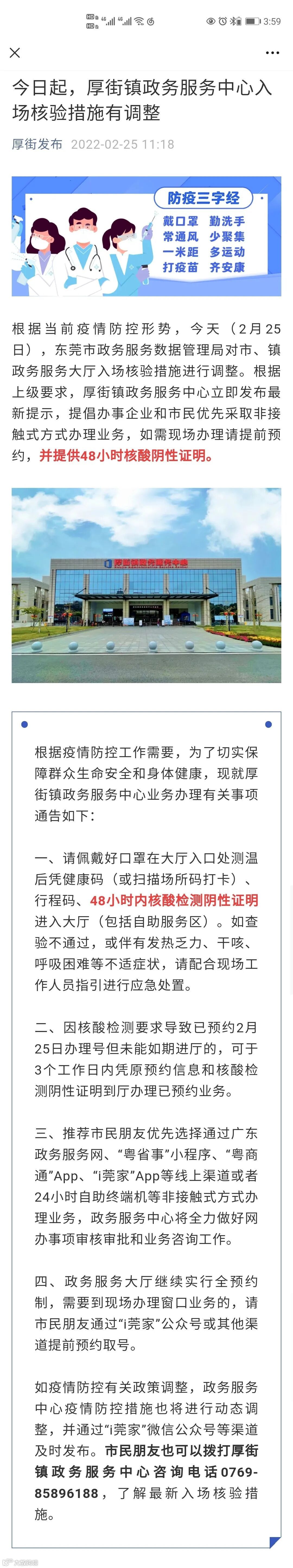 根据当前疫情防控形势,东莞市、镇政务服务大厅自2022年2月25日(星期五)早上起调整入场核验措施,现将有关事项通告如下: