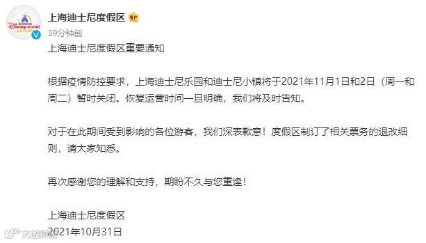 昨天(10月31日)傍晚18时许,上海迪士尼度假区官方微博发布通知称,为配合新冠肺炎疫情流行病学调查,上海迪士尼乐园和迪士尼小镇从即刻起停止游客进入,已在乐园的游客在离园时需要在出口处接受核酸检测。
