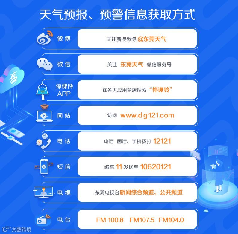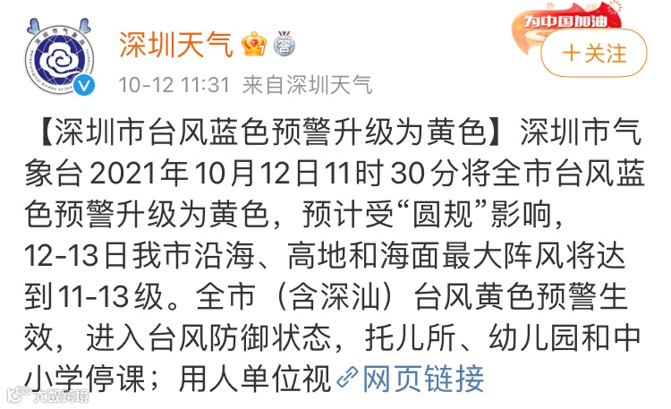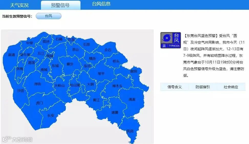 东莞市气象台已于10月11日19时00,将台风白色预警信号升级为蓝色。