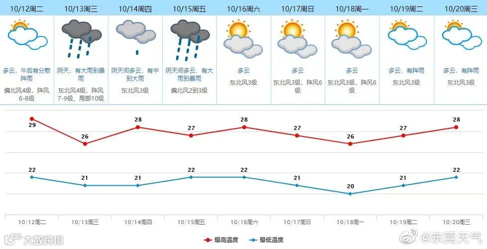 10月12日白天:多云,午后有分散阵雨,气温22-29℃,偏北风4级、阵风6到8级;