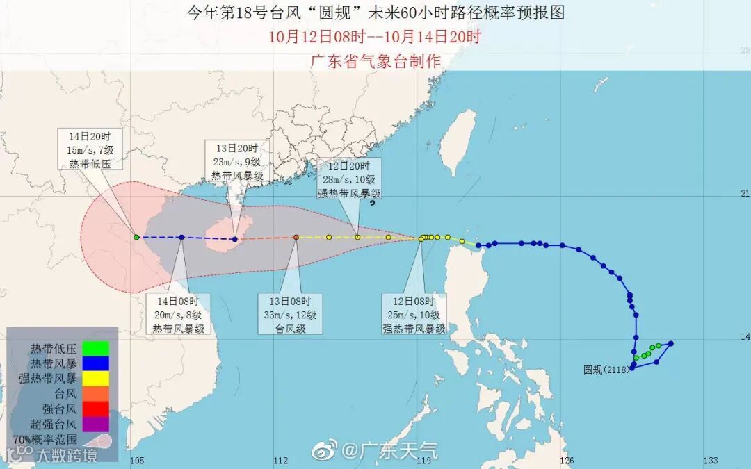 据广东省气象局报道,今年第18号台风“圆规”(强热带风暴级)的中心今天(12日)08时位于南海东北部海面上,距离海南省万宁市偏东方向约930公里。七级风圈半径东北方向380公里;东南方向260公里;西南方向260公里;西北方向420公里。预计,“圆规”将以每小时28公里左右的速度向偏西方向移动,强度将有所加强,最强可达强热带风暴级或台风级(10-12级,28-33米/秒);并将于13日下午到晚上在海南文昌至三亚一带沿海登陆,登陆时强度为强热带风暴级(10-11级,25-30米/秒)。