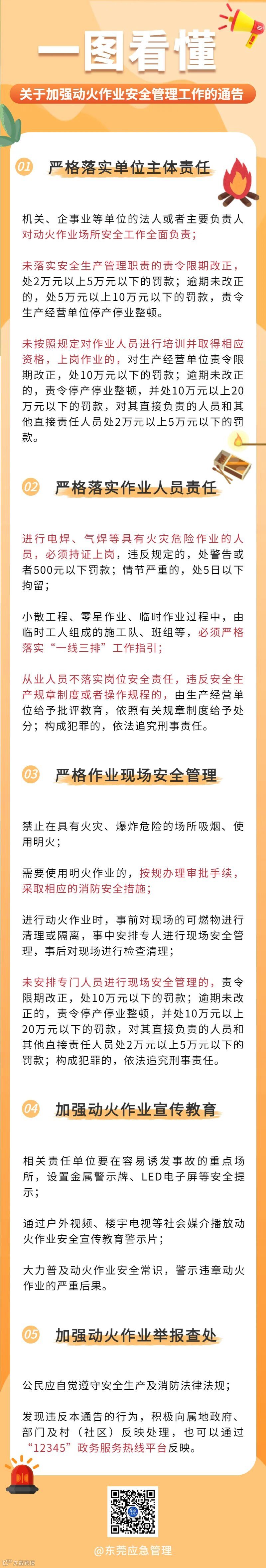 四、加强动火作业宣传教育。相关责任单位要在容易诱发事故的厂房仓库、冷库、批发市场、商业综合体、在建工地和劳动密集型企业等重点场所,在醒目位置设置金属警示牌、悬挂横幅、LED电子屏等安全提示,通过电影院、户外视频、楼宇电视等社会媒介播放动火作业安全宣传教育警示片,大力普及动火作业安全常识,警示违章动火作业的严重后果。