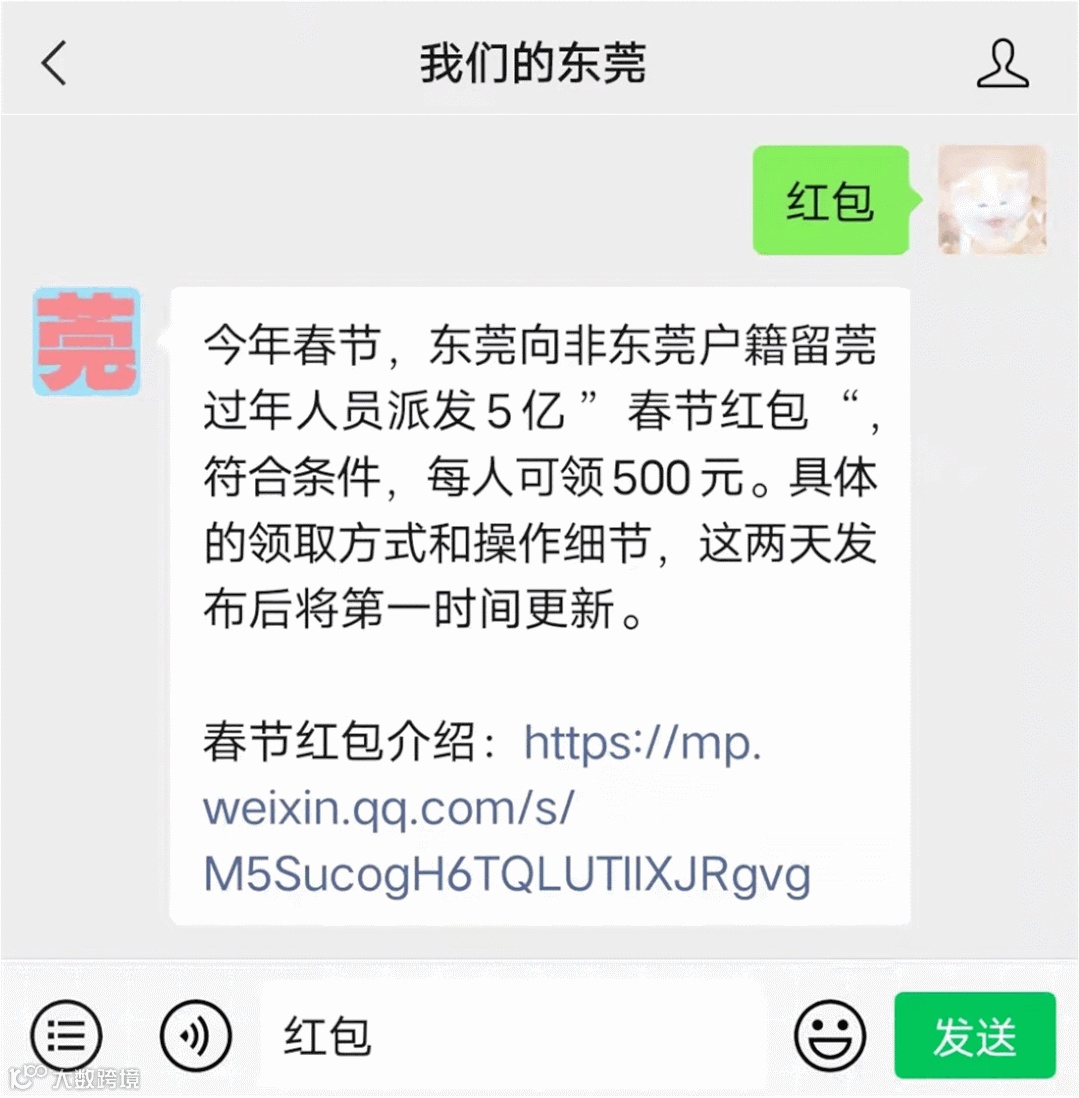 第二步:在“我们的东莞”公众号底部对话框回复“红包”,点击发送,即可查看最新消息。如下图所示。