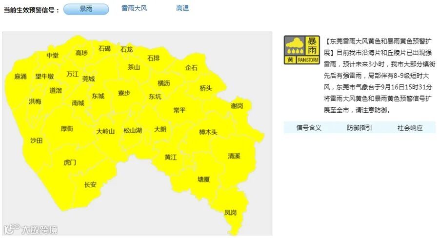 ▲东莞雷雨大风黄色和暴雨黄色预警扩展至全市