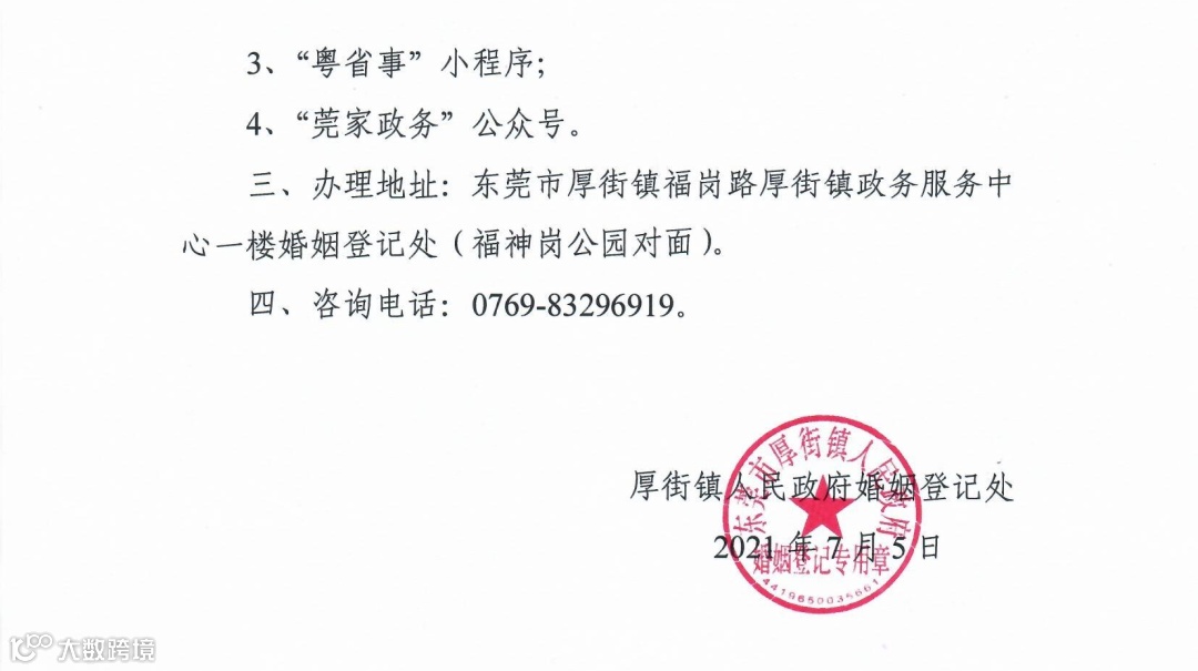 办理地址:东莞市厚街镇福岗路厚街镇政务服务中心一楼婚姻登记处(福神岗公园对面)