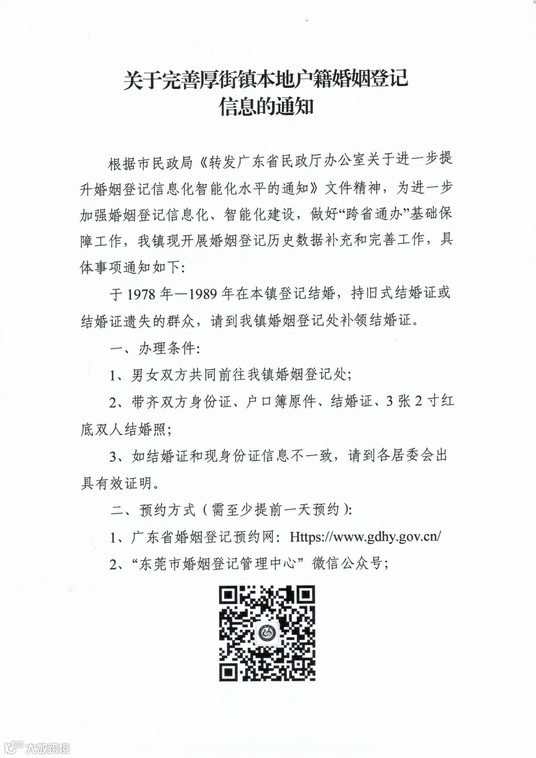 昨日(7月5日),小编从厚街公共服务办获悉,根据上级有关文件精神,厚街现开展婚姻登记历史数据补充和完善工作,对1978年至1989年在厚街登记结婚、持旧式结婚证或结婚证遗失的居民进行补办结婚证。请在补办范围内的居民尽快到厚街婚姻登记处补领结婚证。