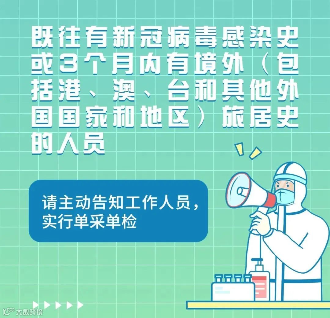 既往有新冠病毒感染史或3个月内有境外(包括港、澳、台和其他外国国家和地区)旅居史的人员,请主动告知工作人员,实行单采单检。