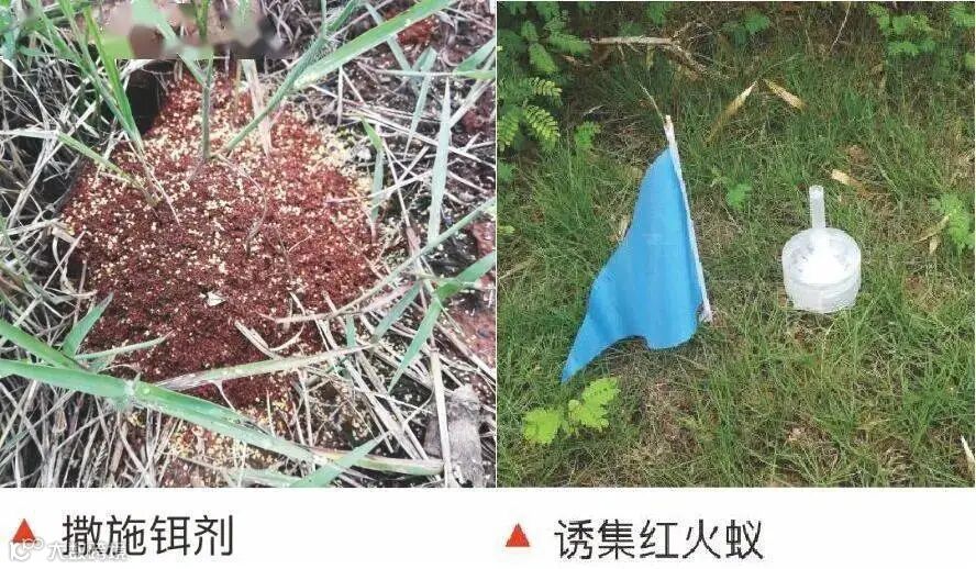 (2)科学防治。红火蚁是社会性昆虫,灭杀蚁后才是防治的核心和目标。喷雾、水淹、火烧等方法不能灭杀蚁后,还会刺激蚁后分巢或迁移,加速其扩散。应采取“饵剂诱杀为主、粉剂灭杀为辅”的策略进行药剂防治,且务必选择使用“三证”齐全、高效、低毒、低残留的药剂,并依据相关使用说明规范用药。