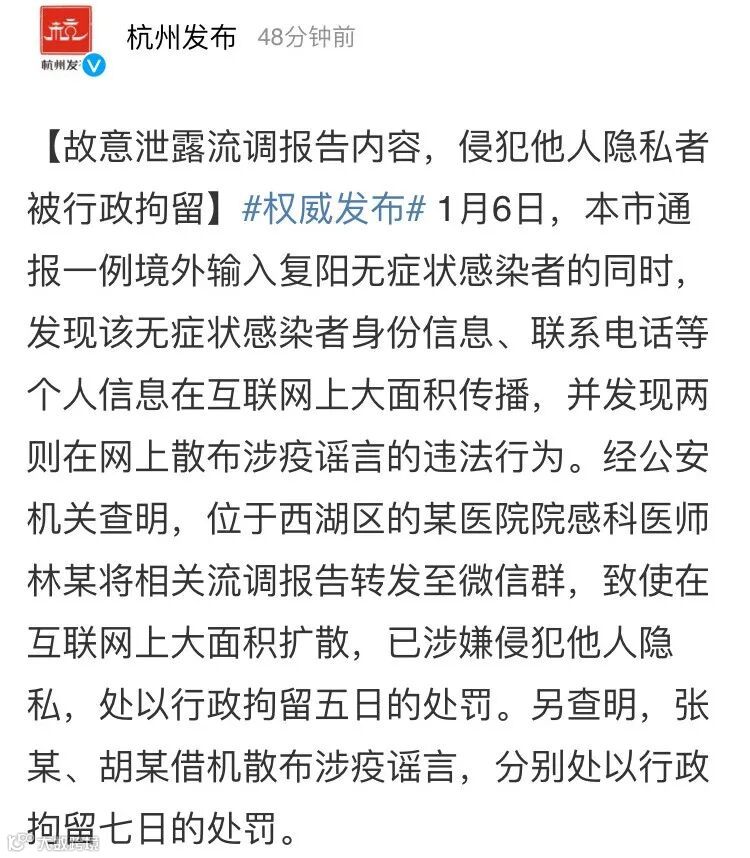 据浙江省杭州市人民政府新闻办公室官方微博“杭州发布”今日(7日)消息,1月6日,杭州市通报一例境外输入复阳无症状感染者的同时,发现该无症状感染者身份信息、联系电话等个人信息在互联网上大面积传播,并发现两则在网上散布涉疫谣言的违法行为。经公安机关查明,位于西湖区的某医院院感科医师林某将相关流调报告转发至微信群,致使在互联网上大面积扩散,已涉嫌侵犯他人隐私,处以行政拘留五日的处罚。另查明,张某、胡某借机散布涉疫谣言,分别处以行政拘留七日的处罚。