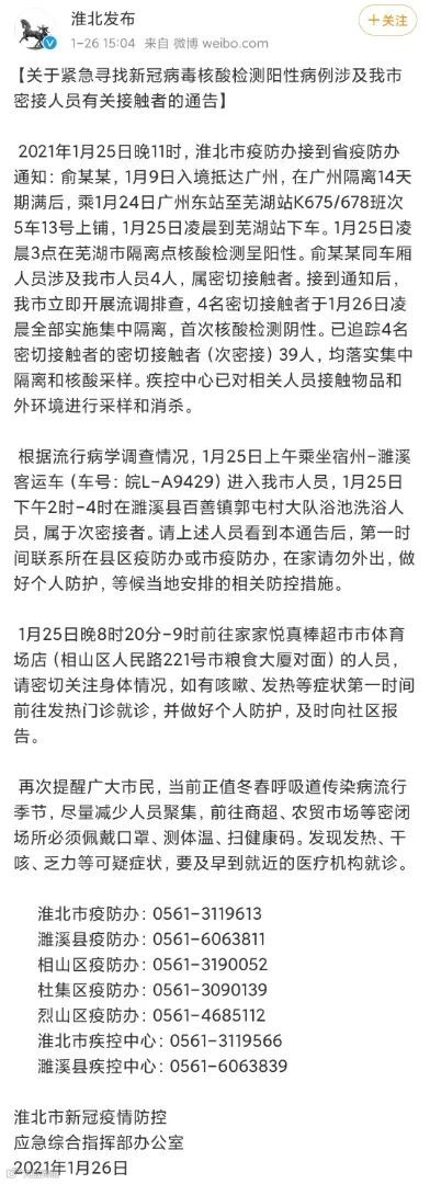 根据淮北发布公布的信息,2021年1月25日晚11时,淮北市疫防办接到省疫防办通知:俞某某,1月9日入境抵达广州,在广州隔离14天期满后,乘1月24日广州东站至芜湖站K675/678班次5车13号上铺,1月25日凌晨到芜湖站下车。