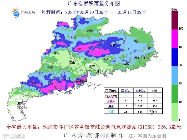 广东气象台消息:据气象监测,10日09时到11日09时,全省平均雨量32.0毫米,超过25毫米镇街占全省总镇街数的48.8%,有11个镇街录得超过250毫米的特大暴雨,有129个镇街录得100毫米~250毫米的大暴雨,有207个镇街录得50毫米~100毫米的暴雨,有406个镇街录得25毫米~50毫米的大雨,各市雨量最大的镇街有:珠海斗门区乾务镇326.3毫米、中山三乡镇319.1毫米、阳江阳东区合山机场301毫米、清远清城区飞来峡镇284.3毫米、江门新会区沙堆镇257.5毫米,雨水分布不均匀,但有下到的地方还是挺猛的,珠海、中山、阳江、清远、江门5地均有站点录得特大暴雨量级的雨量。
