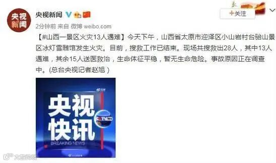 昨日下午,山西省太原市迎泽区小山岩村台骀山景区冰灯雪雕馆发生火灾。目前,搜救工作已结束。现场共搜救出28人,其中13人遇难,其余15人送医救治,生命体征平稳,暂无生命危险。事故原因正在调查中。