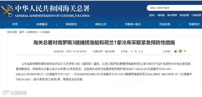 按照海关总署公告2020年第103号的规定,全国海关自即日起暂停接受俄罗斯PROEKT-1GELALTD(注册编号为CH-03P)、DARLALLCSEVNAUCHFLOT(注册编号为CH-31R)、GULDRANGURSAAMILTD(注册编号为CH-63D)3艘捕捞渔船和荷兰DAALIMPEX HARLINGEN BV(注册编号为NL6614EG)1家冷库的进口申报1周,期满后自动恢复。