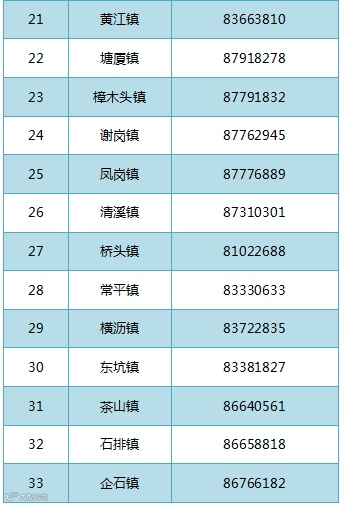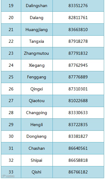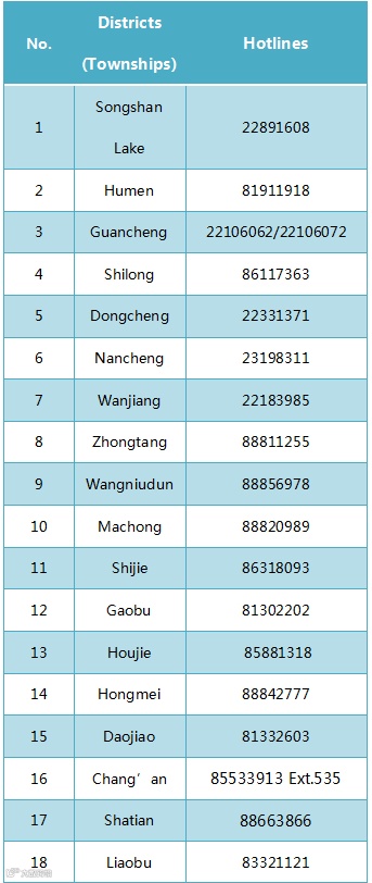 Service hotlines of Economic development Bureau in Different Districts (Townships) in Dongguan
