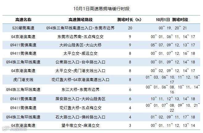 10月1日,东莞市出程易拥堵缓行的高速主要是:S20潮莞高速、G4京港澳高速、G9411莞佛高速等高速的部分路段;