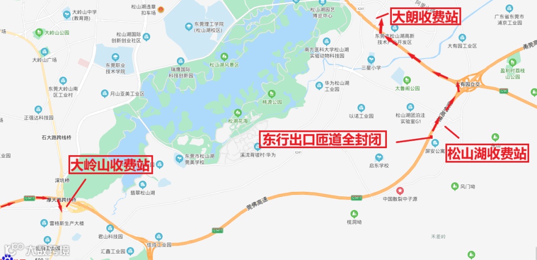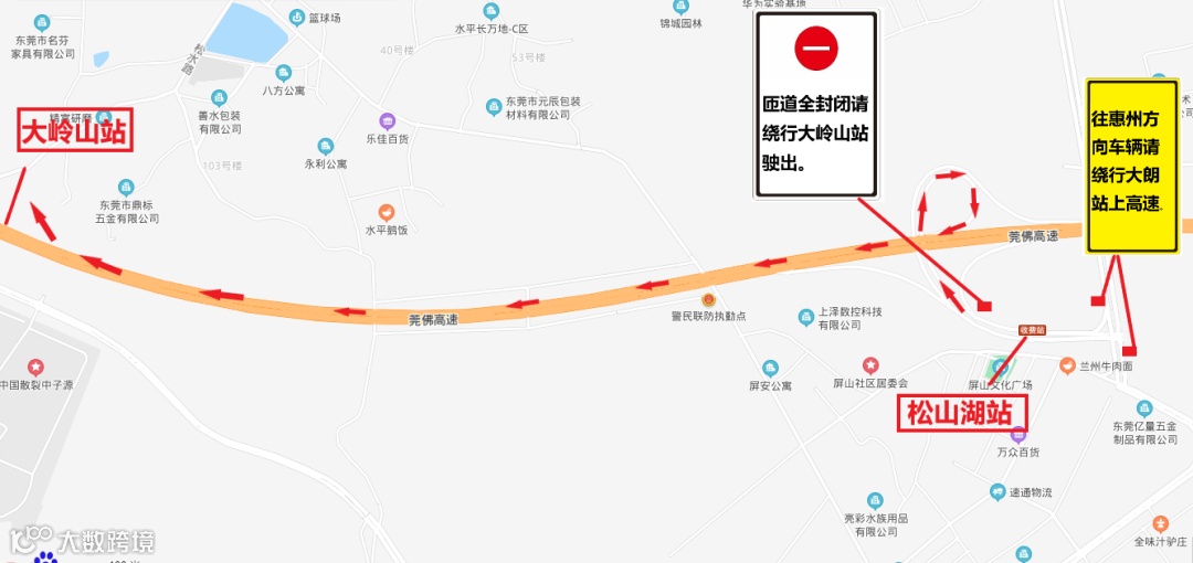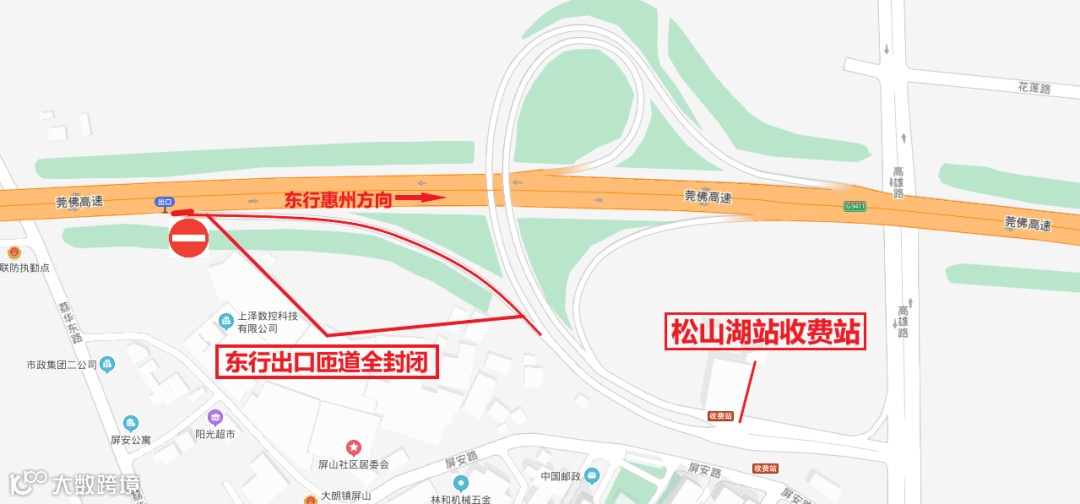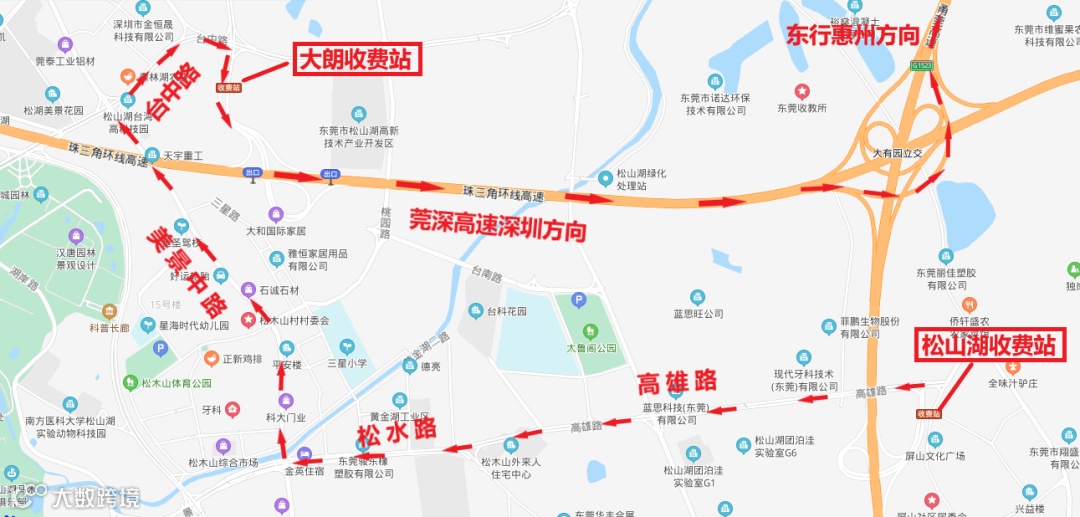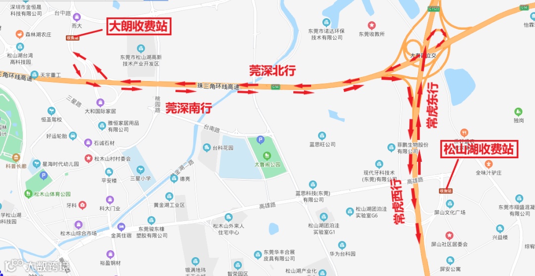 莞深高速南北行往常虎高速西行松山湖站车辆在莞深高速大朗站或常虎高速大岭山站出;