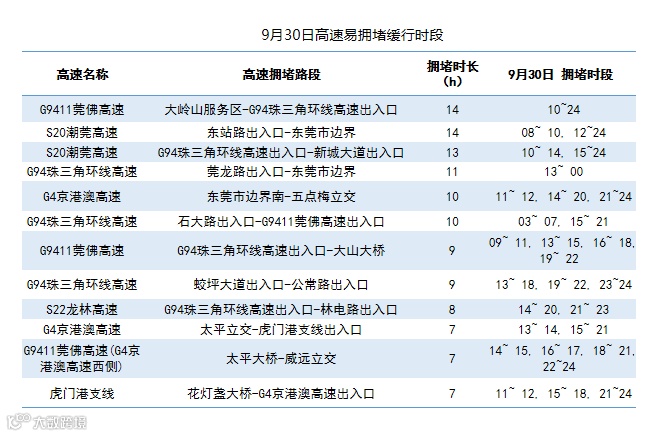 9月30日,东莞市出城易拥堵缓行的高速主要是:G9411莞佛高速、S20潮莞高速、G94珠三角环线高速、G4京港澳高速等高速的部分路段;