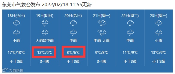 19日,粤西和珠江三角洲中南部市县有大雨局部暴雨,其余市县有中雨局部大雨。气温明显下降,天气寒冷。最低气温:粤北市县4℃~8℃(高海拔山区零下1℃~1℃),南部沿海市县10℃~14℃,其余市县8℃~10℃。粤北高海拔山区有冰冻,局部有冻雨或雨夹雪。