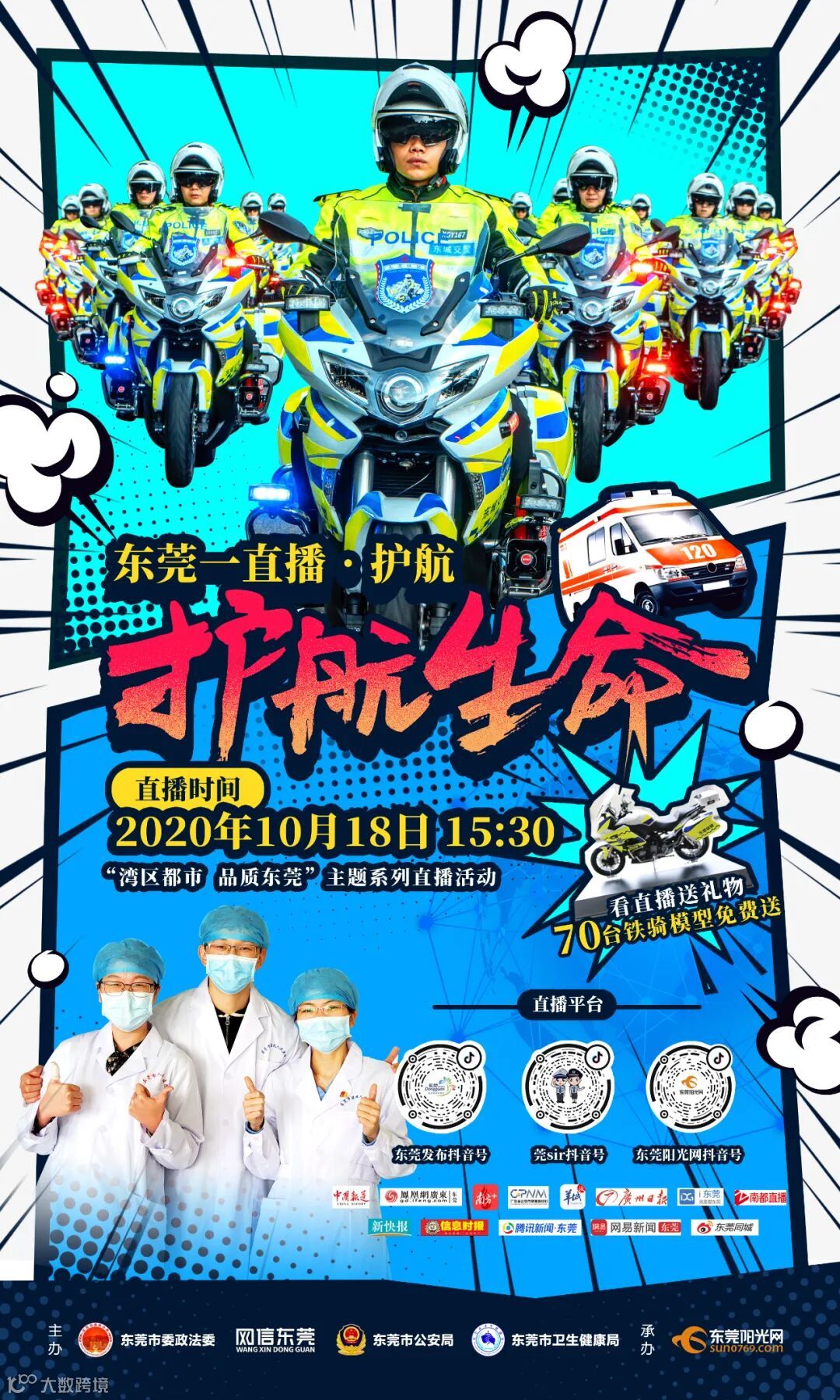 10月18日,首场“护航”主题直播活动中,东莞公安铁骑将与东莞的白衣天使们携手,以“蓝白搭档”扶危救难、抗疫故事为引线,讲述东莞各职能部门为群众生命安全奋斗的事迹。