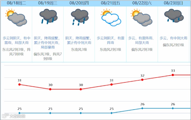 展望22-25日多云,有阵雨或雷阵雨,气温回升。
