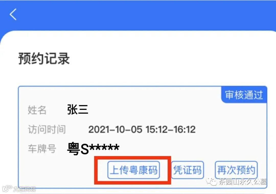 (八)祭扫当天上传所有随行人员的粤康码截图,获取入园凭证。