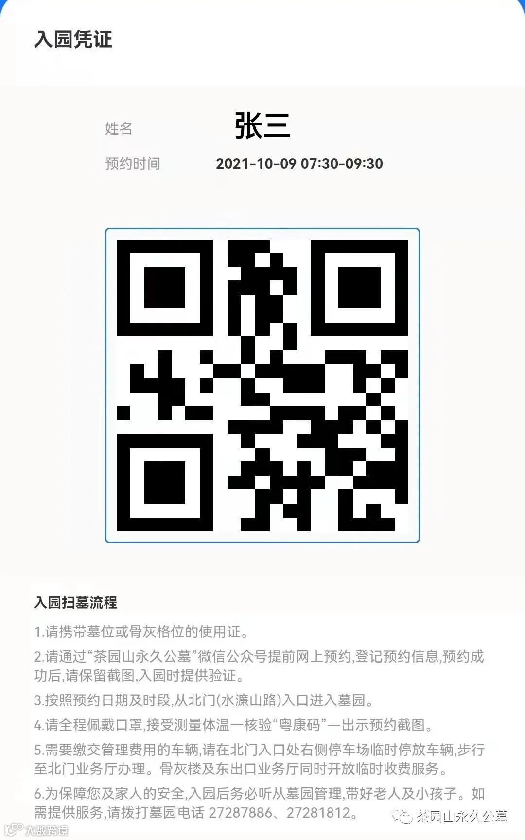 (一)祭扫预约:先通过“茶园山永久公墓”微信号进行预约,祭扫当天上传所有随行人员的粤康码截图,获取入园凭证码。保存入园凭证码、粤康码截图至手机,以备入园时核检。