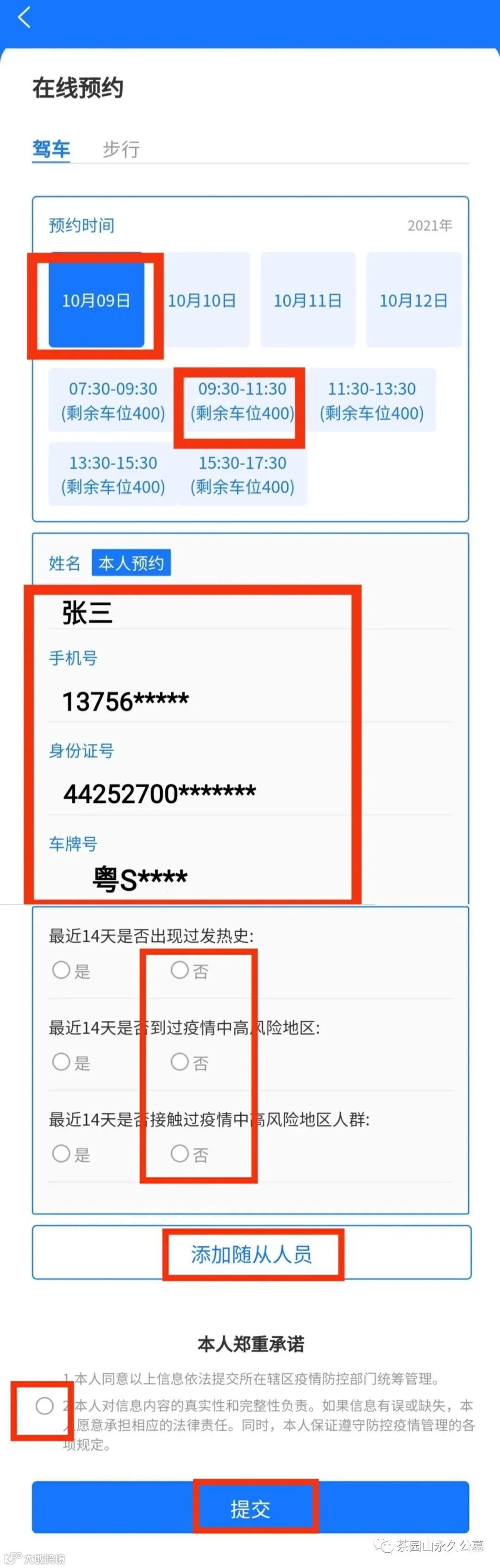 (五)点击“车辆预约”或“步行预约”。选择“预约日期”、“预约时段”、“添加随行人员”填写姓名、身份证号码、车牌号码。根据个人实际情况勾选“健康承诺”,点击“提交”。