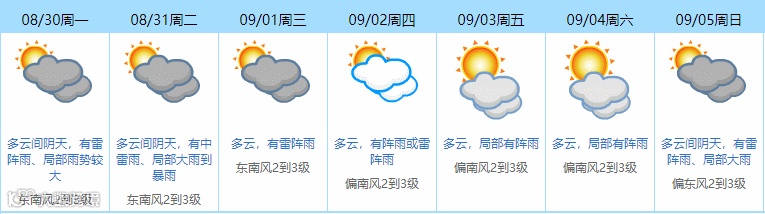 受东风波影响,多云间阴天,有雷阵雨,局部大雨到暴雨;