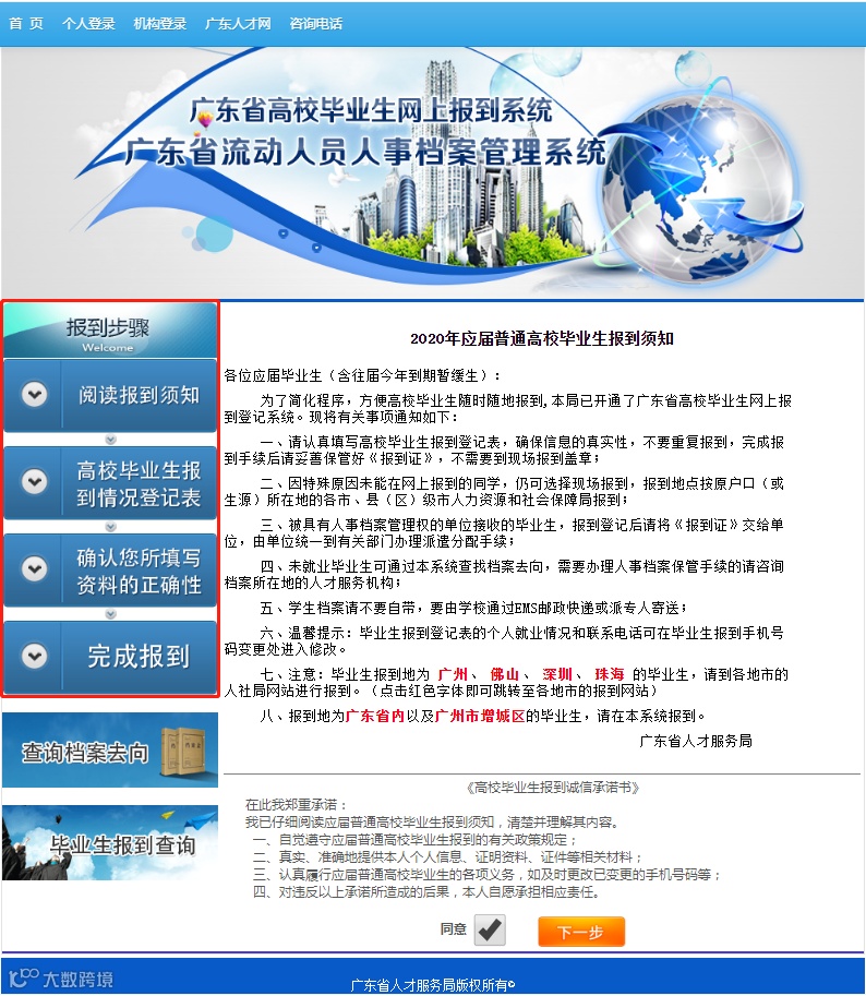 凡派遣到东莞报到的毕业生,不分户籍统一自行登录广东省高校毕业生网上报到系统(网址:http://bd.gdrc.com/) 进行报到,或在手机登录微信粤省事小程序报到。(详细流程请往下阅读)