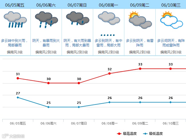 6月5日:多云转中到大雨、局部暴雨,气温26到31℃,偏南风3级;