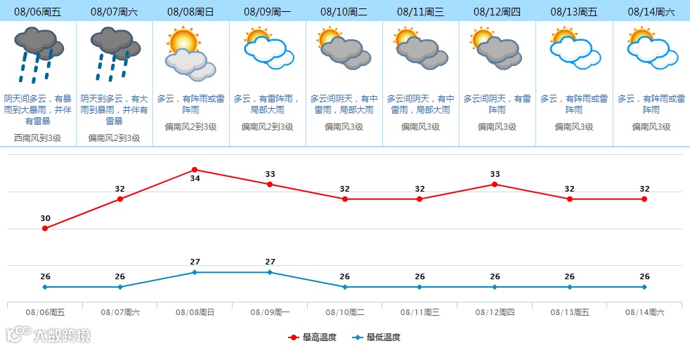 8-9日多云,有雷阵雨,局部大雨;