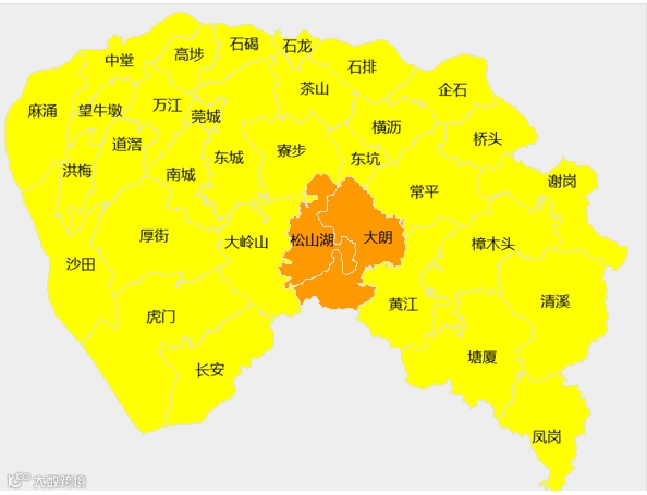 目前东莞部分地区已出现强雷雨,预计东莞大部分镇街将有强雷雨,并伴有7级左右阵风,东莞市气象台于8月5日14时24分将暴雨黄色预警信号扩展至全市,松山湖和大朗暴雨橙色预警持续生效中。