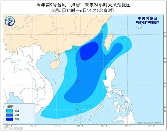 风力方面,预计5日14时至6日14时,南海大部、巴士海峡、台湾海峡、台湾以东洋面以及广东中东部沿海、福建沿海将有6~7级大风,南海东北部、广东东部沿海的风力有8级,阵风可达9~10级。